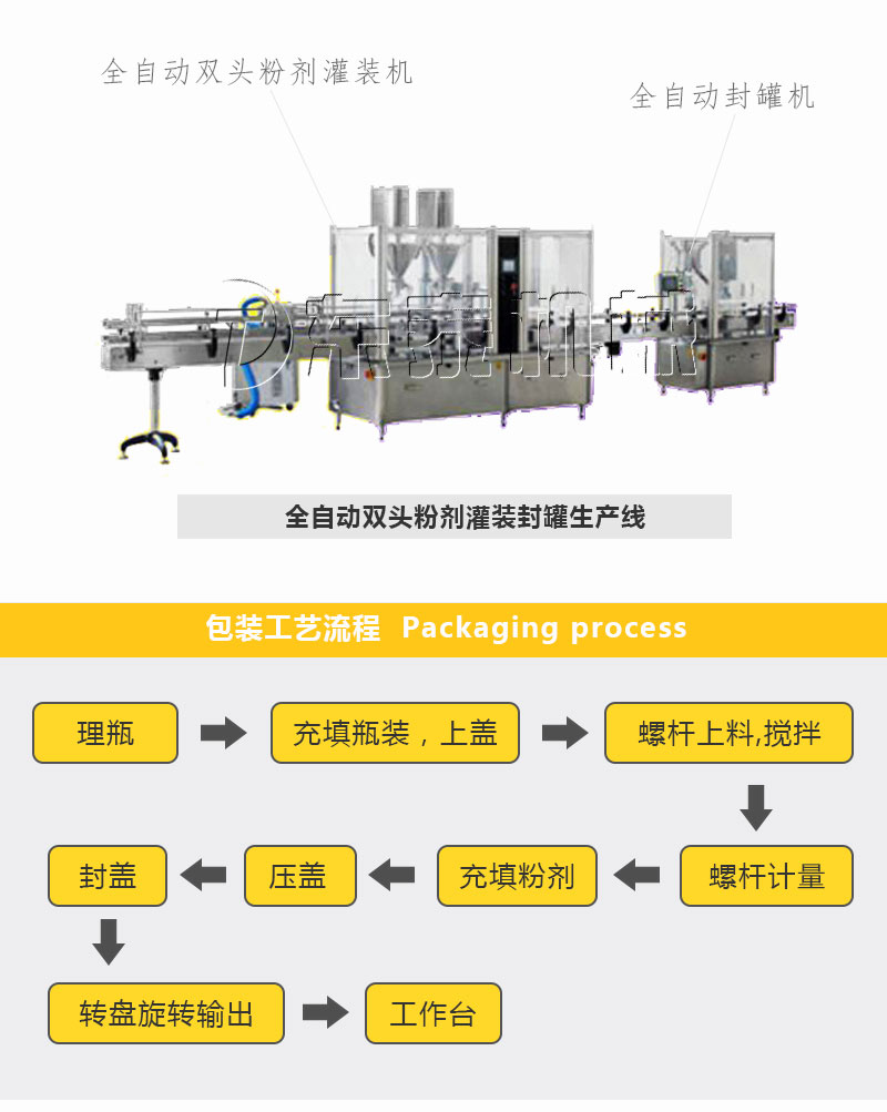 全自動粉劑灌裝機是我公司的主打產品,根據客戶的要求公司開發出了單頭、雙頭、四頭、六頭瓶裝生產線,全自動奶粉灌裝機專門針對藥品、保健品、食品行業的粉劑瓶裝。結合不同的客戶需求可配套:上料(螺桿、真空)、自動理瓶,單(雙)頭加塞、旋蓋、軋蓋、壓蓋等,鋁箔封口(風冷、水冷),金檢,鋁箔塞墊,貼標,碼瓶熱收縮,裝盒,三維包裝(帶金線),裝箱等。
