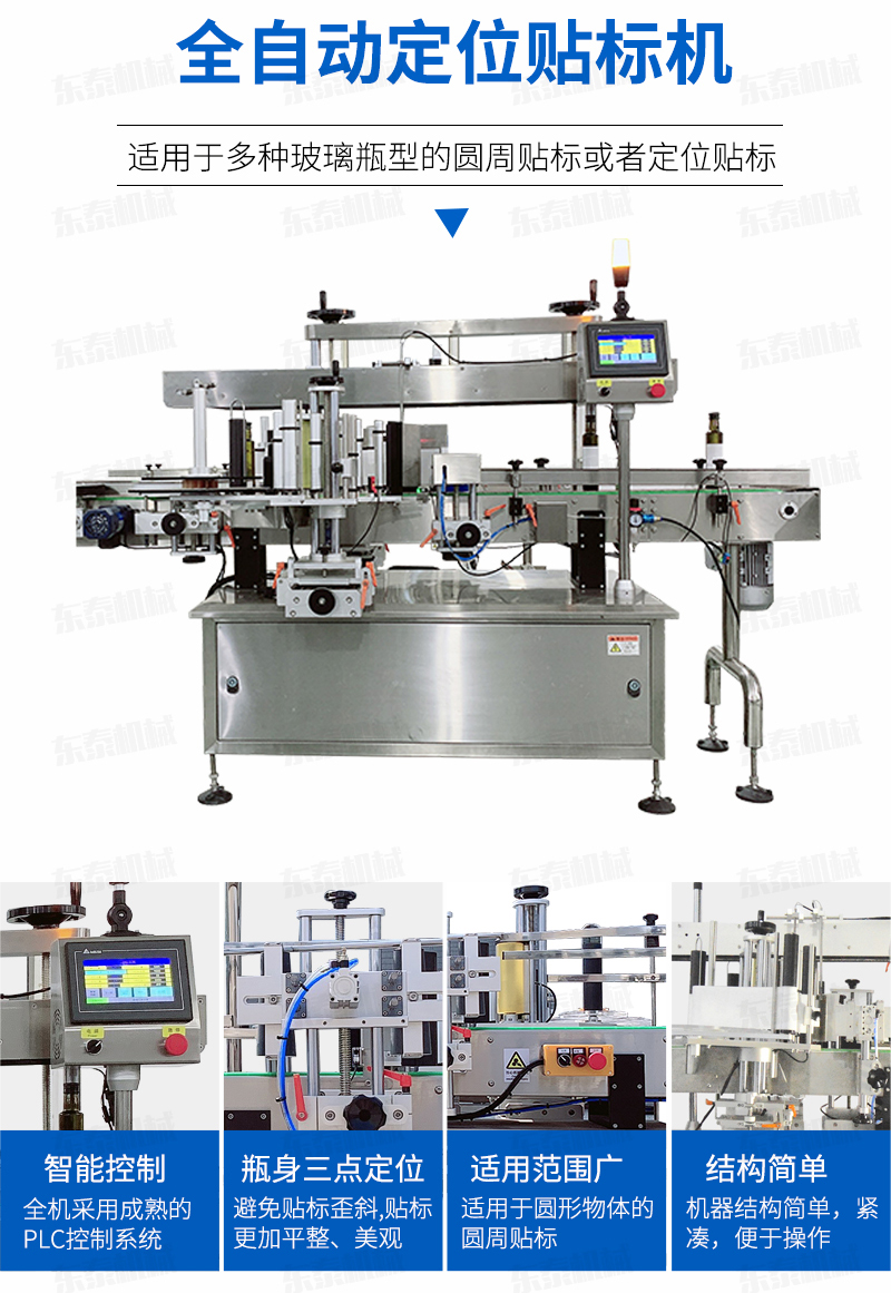 本機適用于食品、醫(yī)藥、化妝品及其它輕工行業(yè)中的扁瓶貼標、方瓶貼標、圓瓶貼標之理想設備。功能操作簡單,結構緊湊。采用光電檢測,PLC控制,觸摸式軟件操作,輸送帶、扶正帶、頂帶、卷瓶帶均為無級變頻調速,具有貼標準確、精度高等優(yōu)點;同時具有無物不貼標,無標自動校正、自動檢測等功能。本機既可單機使用,也可與其它包裝機自動連線使用。