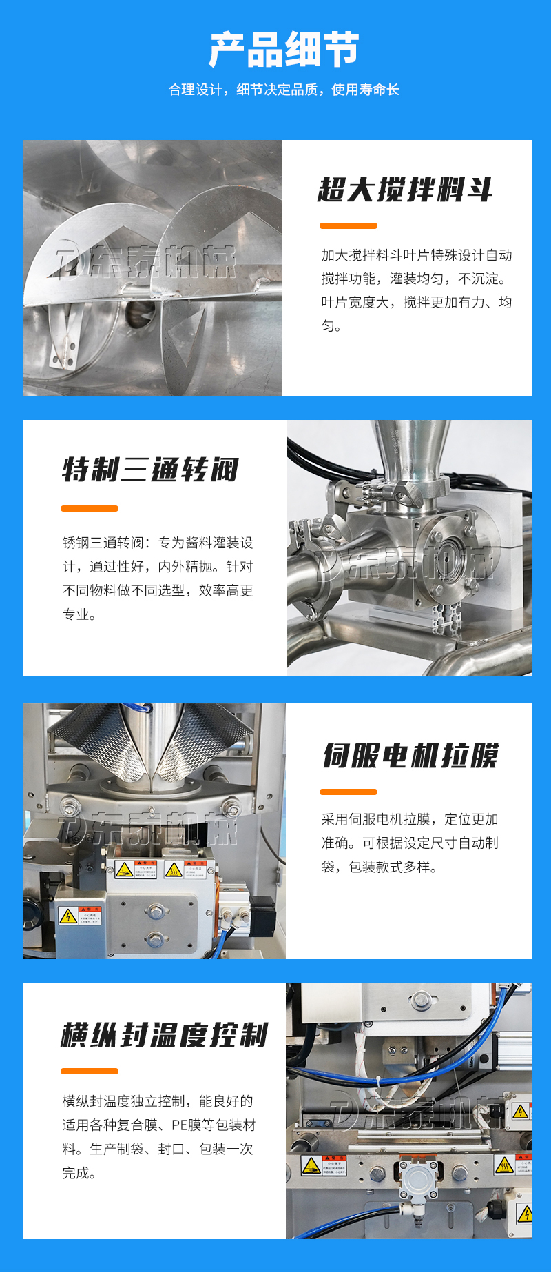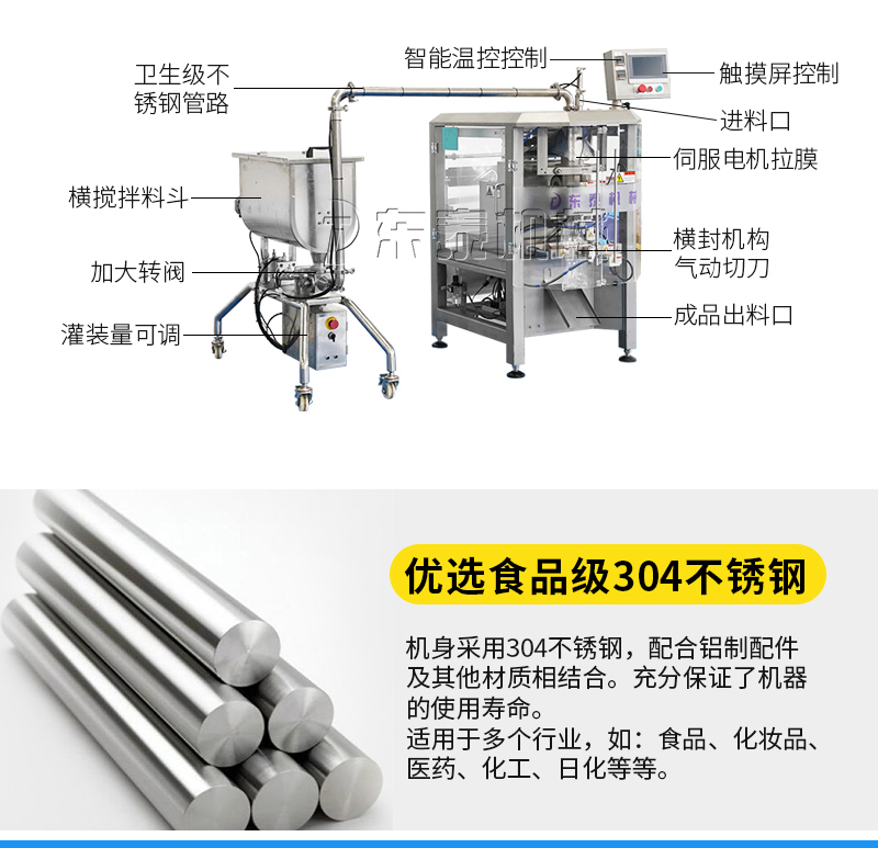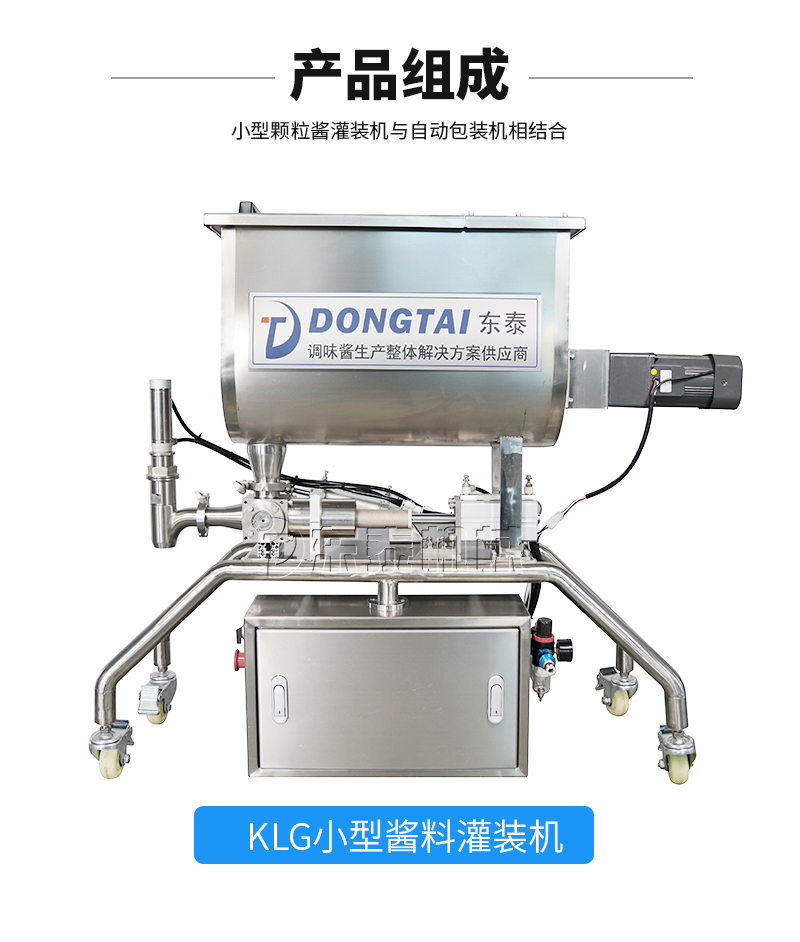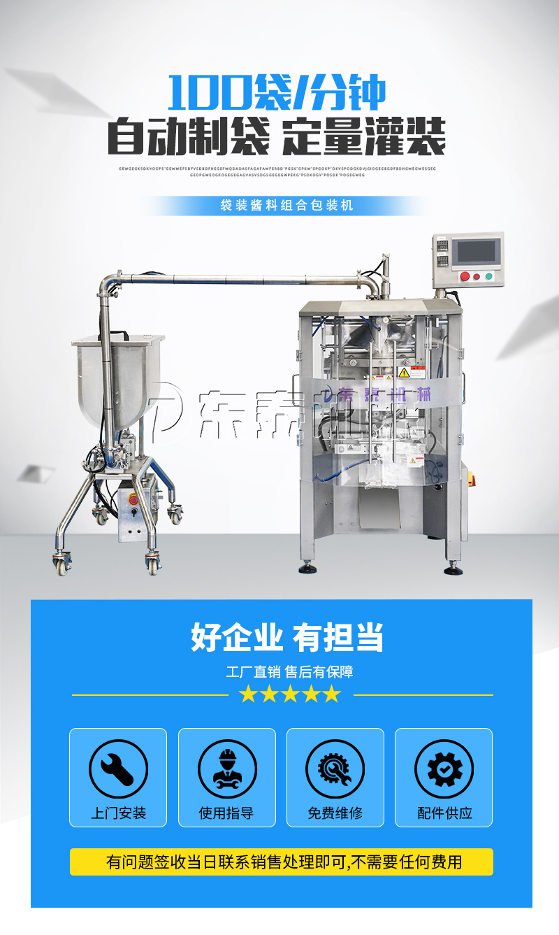 本機(jī)器主要用于調(diào)味品醬料的自動化包裝,機(jī)器安裝有橫向螺帶式攪拌,使油醬混合均勻,確保灌裝精度和產(chǎn)品包裝成品的均勻性。灌裝計(jì)量設(shè)備安裝有萬向輪,管路鏈接均采用快拆接頭,方便灌裝機(jī)拆卸移動清洗。包裝設(shè)備采用全伺服驅(qū)動器,包裝速度快,運(yùn)行穩(wěn)定。