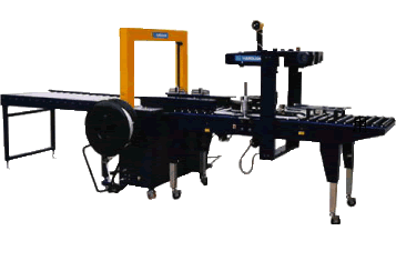 該打包機自動封箱,自動捆扎,光電感應,精確無誤,自動輸送,自動轉向,可調節打包距離。