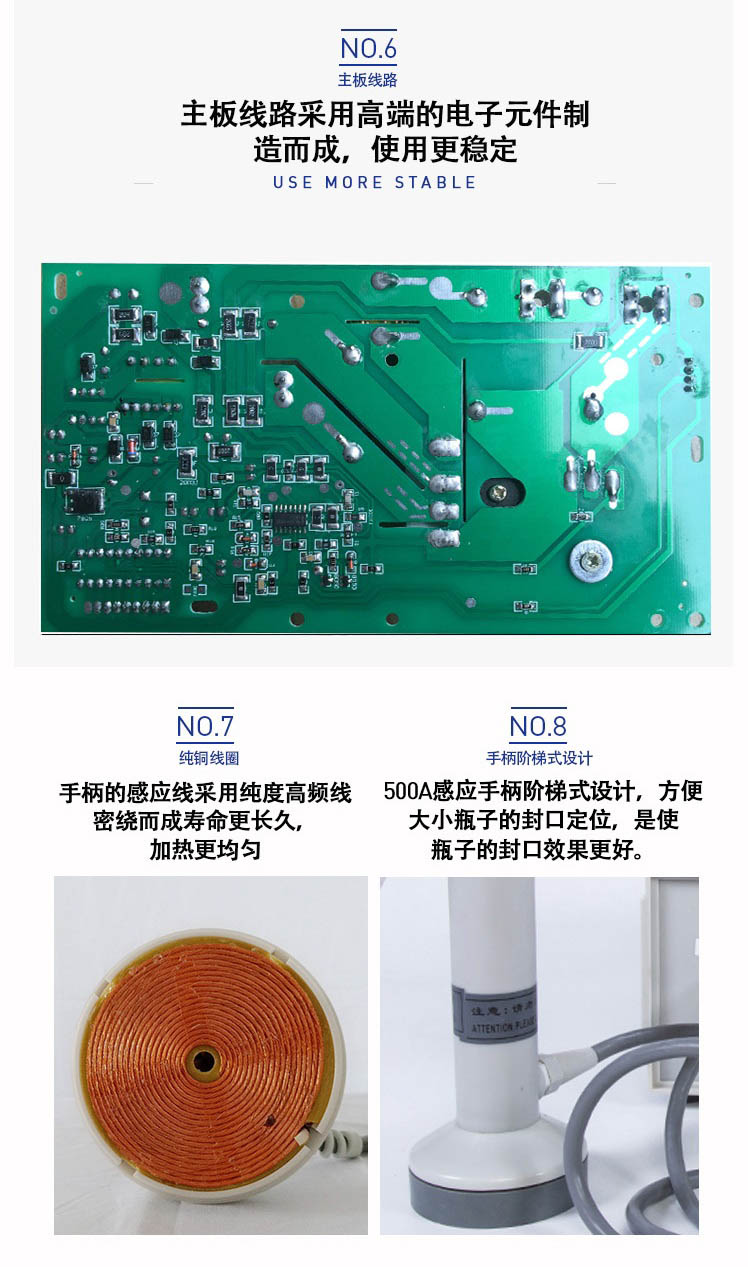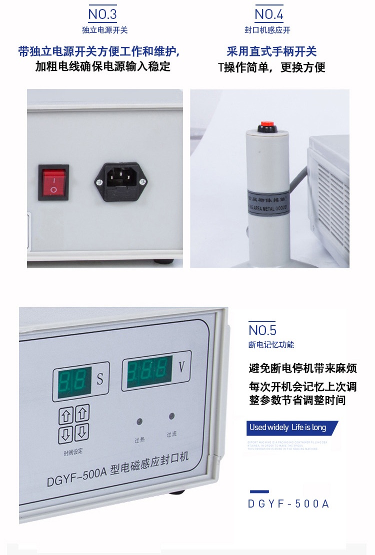 該封口機(jī)是一種便攜式電磁感應(yīng)加熱封口設(shè)備,專為制藥、化工、農(nóng)藥、食品、化妝品、輕工行業(yè)對(duì)容器進(jìn)行鋁箔嚴(yán)密封口。封口材質(zhì)使用廣泛,可以是聚乙烯、聚丙烯、聚苯乙烯、聚酯以及玻璃瓶,但不能用于金屬瓶體及瓶蓋。本機(jī)小巧輕便,使用簡單,適用于小批量生產(chǎn)和實(shí)驗(yàn)室作業(yè)。本機(jī)采用國外先進(jìn)線路,選用日本最新模塊化功率器件,較于一般電子感應(yīng)加熱器更省電,熱效率達(dá)到90%以上,瞬時(shí)加熱速度為后者的20-30倍,因此不僅適用于熱封性能較好的聚乙烯、聚丙烯材質(zhì)的瓶體,而且對(duì)熱封性能較差的聚酯瓶、玻璃瓶也有極好的封口效果。